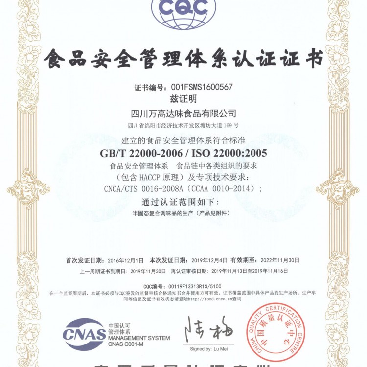 食品安全管理體系認證證書