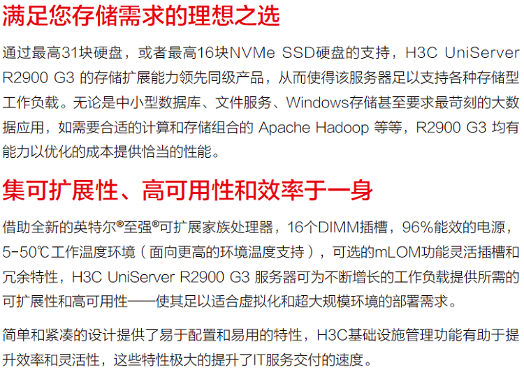 通過支持31塊硬盤,或者支持16塊NVMe SSD硬盤的支持,H3C UniServer R2900 G3 的存儲擴展能力領先同級產品,從而使得該服務器足以支持各種存儲型工作負載。無論是中小型數據庫、文件服務、Windows存儲甚至要求苛刻的大數據應用,如需要合適的計算和存儲組合的 Apache Hadoop 等等,R2900 G3 均有能力以優化的成本提供恰當的性能。