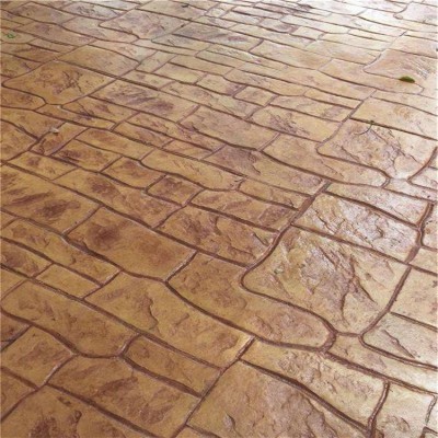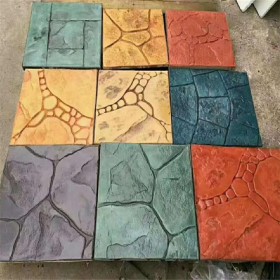 5、使用藝術地坪模具對地坪面層進行紋理處理。藝術地坪模具應配套使用,首先確定好紋理的分布方向,選好一塊模具放置的位置和角度,然后其它的模具依次緊貼一塊模具放置。彩色混凝土藝術地坪壓模采用壓模,壓模應由技術較好的人員進行作業以保證壓紋深度一致和模具放置的準確性。